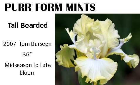 MTB = Miniature Tall Bearded - 16" - 27.5" - delicately formed blooms on thinner stalks - bloom before the TBs